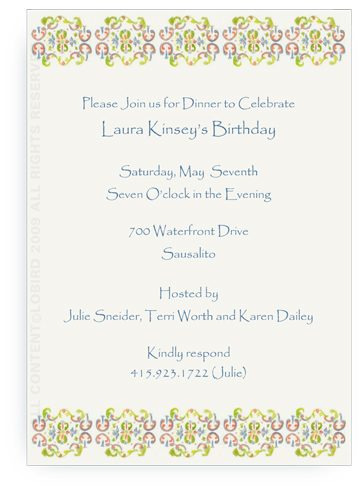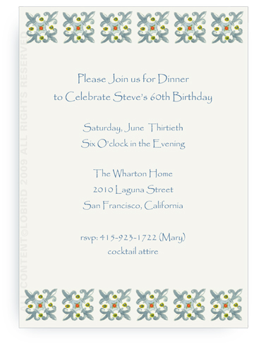 Host your next event using our wonderful invitations. They are beautifully printed on premium white cards and include envelopes. Matching place cards, menu cards, gift tags and thank you cards are also available.